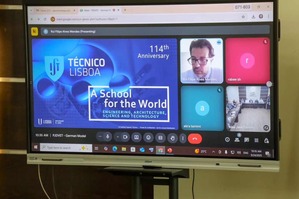 Following this, the delegation from the University of Lisbon presented an overview of the institution and its experiences, along with a general introduction to the project. Project Director Eng. Safa Seder delivered a presentation on the German model of dual vocational and technical education and explained how it could be adapted to design a Palestinian-Jordanian model that strengthens the role of vocational and technical training while remaining aligned with the local contexts of both countries. Project team members Eng. Mo’tasem Natsheh and Eng. Alaa Tamimi outlined the origins of the initiative, its objectives, expected outcomes, and its significance for both Palestine and Jordan.